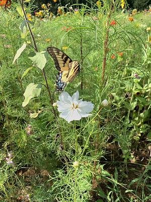 A butterfly caught in midair in a flower field at the North Carolina Museum of Art.